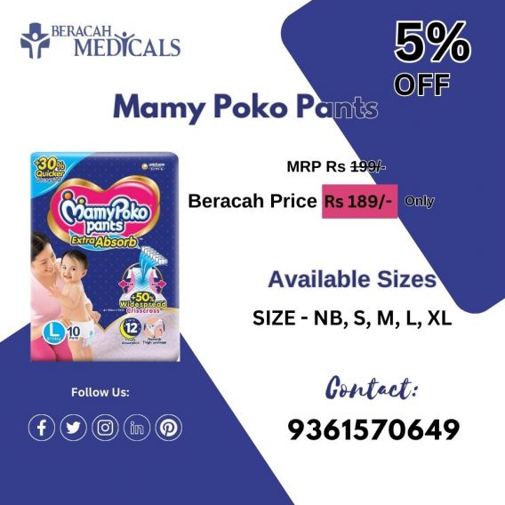 Choose Mamy Poko Pants-Baby Diaper online at low prices from Beracah Medicals and enjoy flat 5% discount. It absorbs +30% more quickly and repeatedly. Prevents leakage without heaviness, Easy to wear, Upto 10 hours of absorption! For orders, Call/WhatsApp: 9361570649
